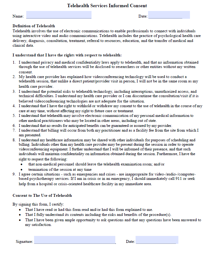 Telehealth consent varies by each state and payer source. Below are two sample Telehealth Consent forms. (Click on the form for a downloadable copy.)