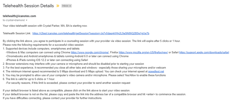 ICANotes Telehealth is HIPAA compliant and a secure, fully-featured and comprehensive behavioral health telemedicine application. An email is sent to the client from the clinician within ICANotes. The client then clicks the secured, encrypted link. Once the link is pressed, the telehealth session starts within the web browser. No download is needed on the client’s side.