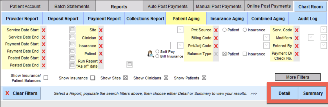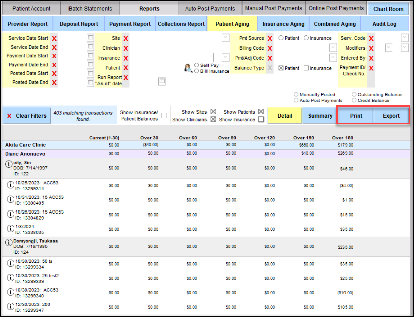 3. In ICANotes, we separate the Patient Aging and Insurance Aging to help assist you with filtering relative data. If you want to see both patient and insurance, you can use the Combined Aging. You do not need to put in start/end dates to generate the aging reports.