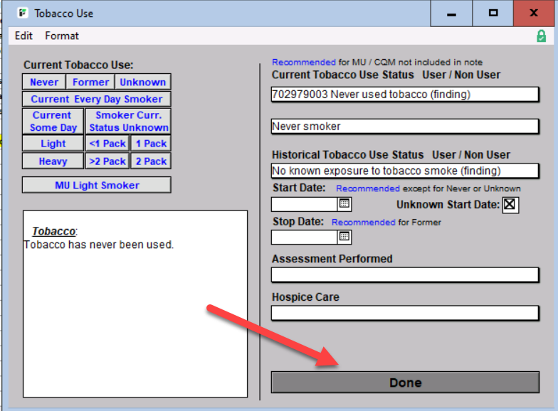 This is an example of a filled in Tobacco Use window. Click Done when you're finished to return to the previous note work area.