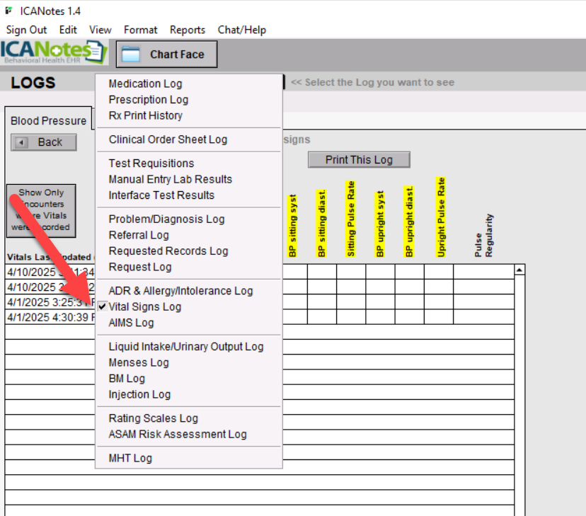 This will bring up the Logs area of ICANotes, but you'll need to look for the drop-down menu on the top-left and select "Vital Signs Log" from the list.