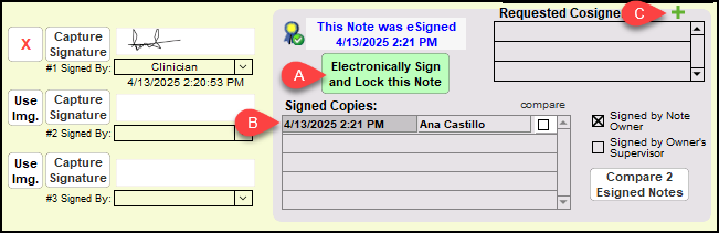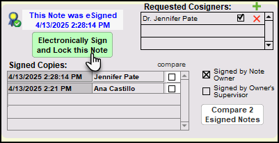5. If you have been requested to sign a document. Go to the Compiled Note from the Chart Face (or Work Areas to review the Treatment Plan). Once you are satisfied with the note, click the Electronically Sign and Lock this Note button. You will note that under Requested Cosigners a checkmark will appear by your name and under Signed Copies the date, time, and your name will show.