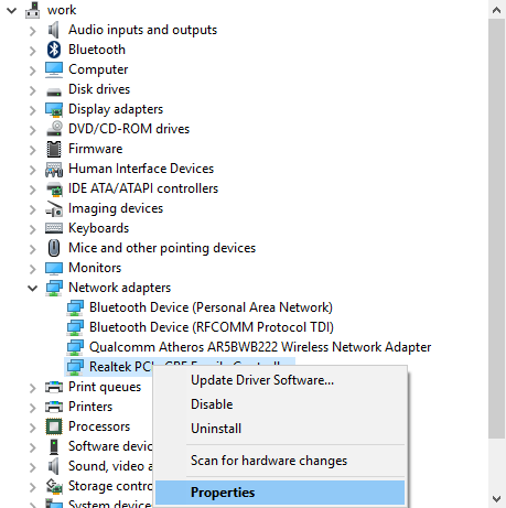 4. Once you have located the network card, right click to get the dropdown menu and select Properties.