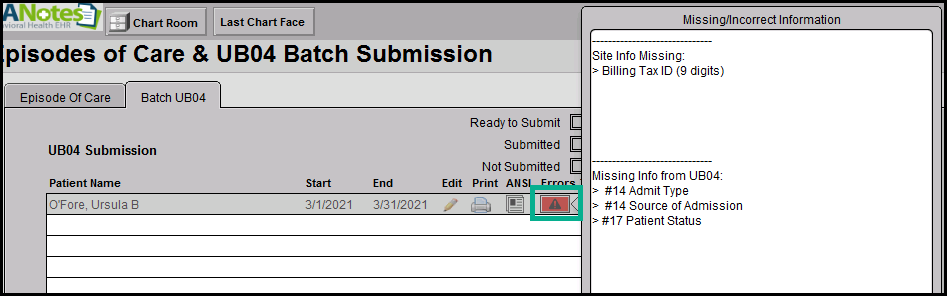 2. If information is missing, a red triangle icon will show under errors. Clicking the red triangle icon will show the missing or incorrect information. Click the 'Edit' option to return to the UB04 form and update4 the missing information to allow for submission of the claim.
