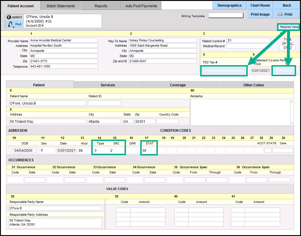 8. To edit your UB04, click the pencil icon shown in the image above. This will open the UB04 work area. Much of the information will be filled out automatically from the information provided in Demographics and the note for the service (if one has been generated). The required fields to submit will be blue until they are filled as shown below. Fields 15, 15 and 17 are required, but are no longer blue since they have been filled in.