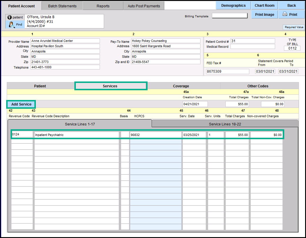 11. Click the 'Services' tab to add or edit services. The image below has a charge added from the note. You can add charges if there is not a note that already populated charges, or there are others to be added.