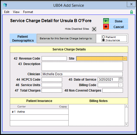 12. Click the 'Add Service' button above field 42 to create a service charge. Revenue Code, Service Date, and Total Charges are required fields. Choose the correct Date of Service for the charge. Once completed, click the 'Done' button to return to the UB04 work area.
