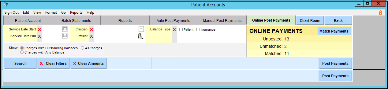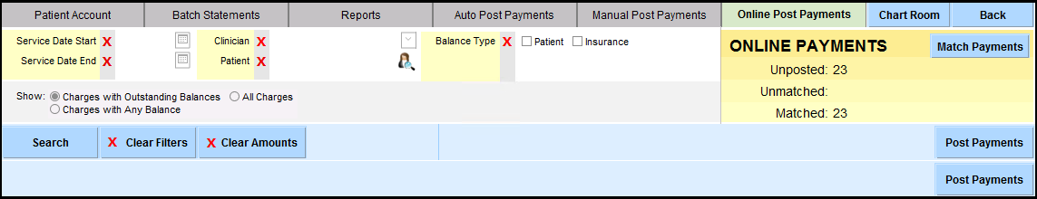 7. You will be brought back to the Online Post Payments tab. To post the payment you just matched, use the filters as necessary and then click the 'Search' button.