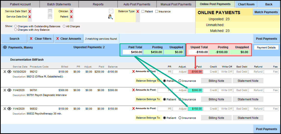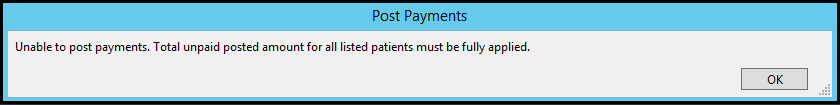 When a negative amount is present in the Unpaid Total, it must be fully applied to post payments. If it is not fully applied an error message will populate.