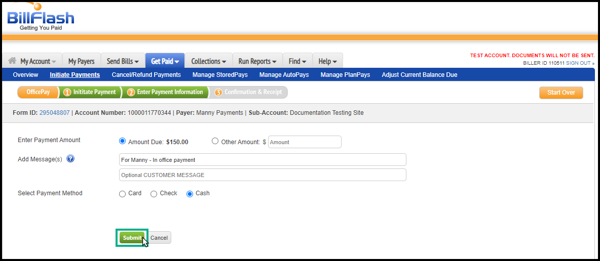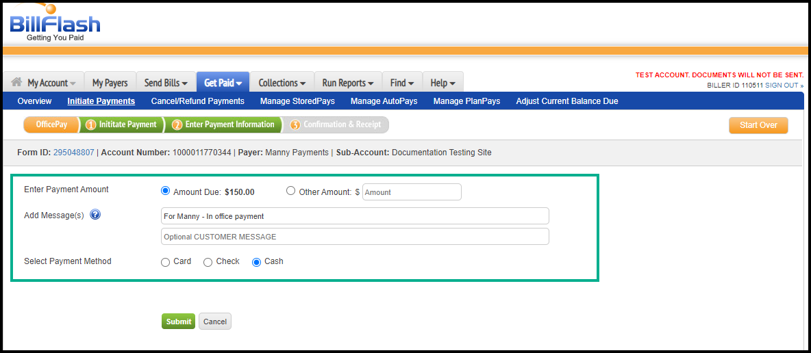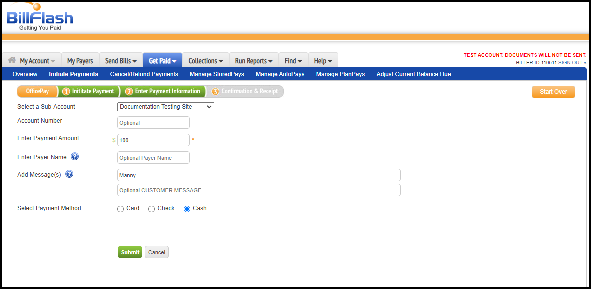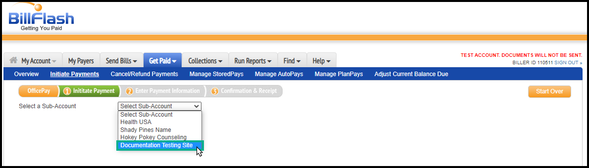 10. Follow the instructions shown above (in step 4) to select a site. In this scenario, you do not need to enter the patient's name or account number; however, make notes under messages to assist the biller in identifying the patient within ICANotes. Fill out following steps 5 and 6 above.