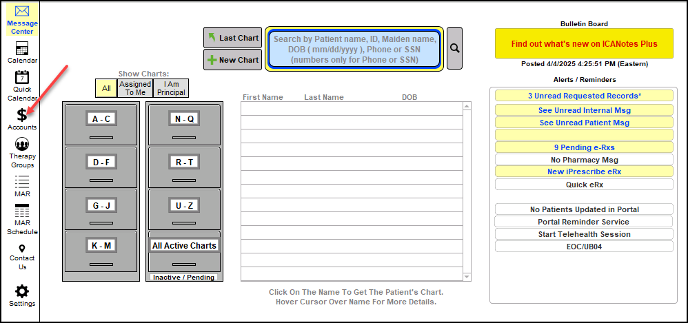 1. From the Chart room, click the 'Patient Accounts' drawer.