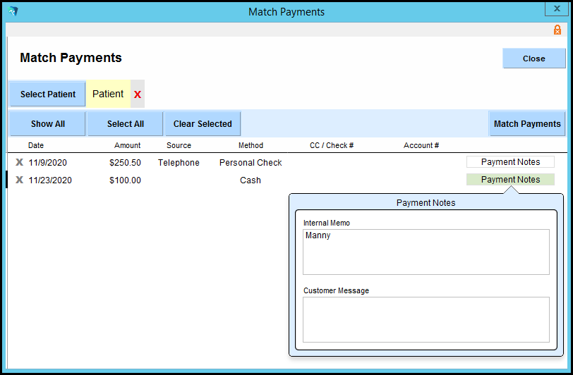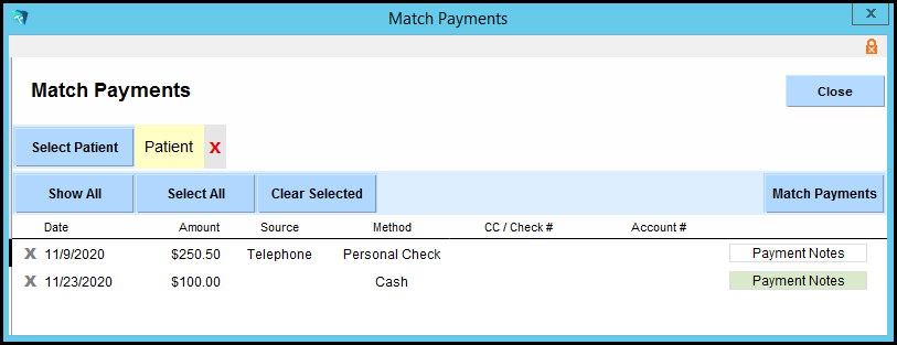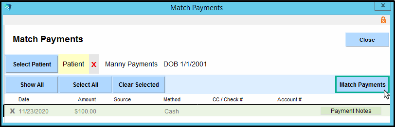 5. The selected patient will show. Highlight the payment by clicking on it and then click the 'Match Payments' button.