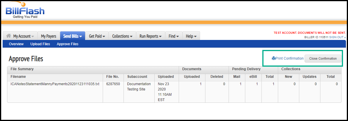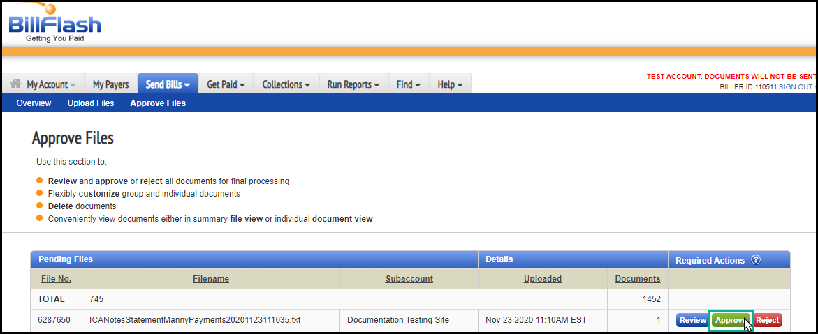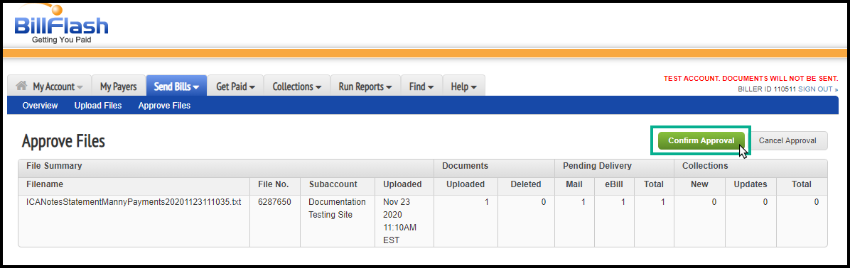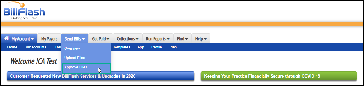 7. Log in to your BillFlash account and click on the “Send bills” tab and select Approve Files from the dropdown menu.