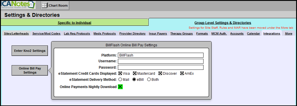 In Settings and Directories, under the Group Level Settings and Directories tab > Integrations tab, click on the 'Online Bill Pay' button. In addition to the BillFlash Username and Password, make sure “Online payments Nightly download” is checked. Please note that payments collected in BillFlash are transmitted to ICANotes overnight and will be available in Online Post Payments the next business day after collection.