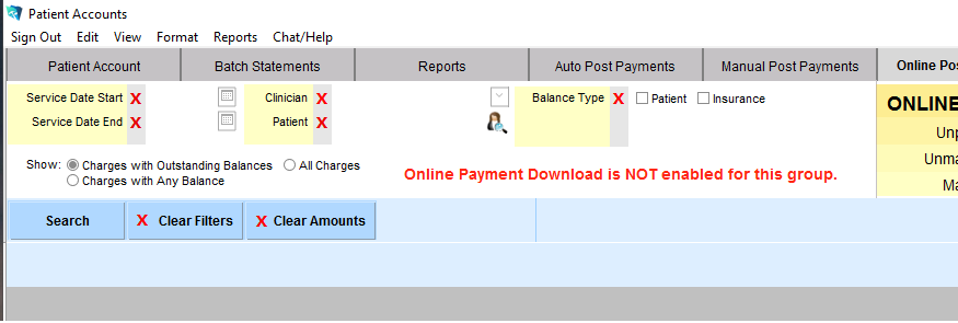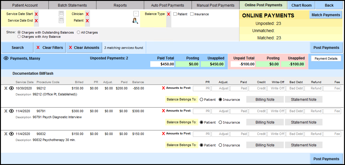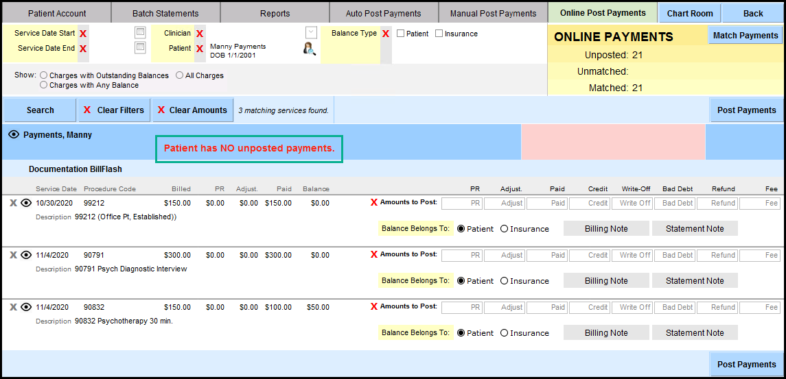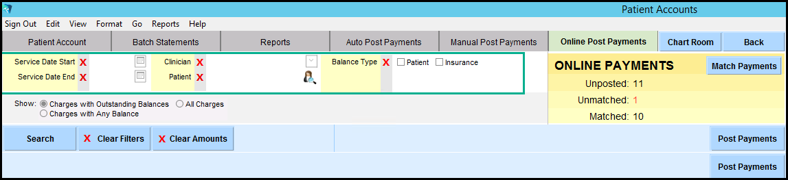 3. In the screenshot shown directly below, on the right side under Online Payments, you can see that there are several matched payments. Since there are multiple Online Patients, in this guide a filter is used to show only one patient. You may want to use the filters of Service Date Start/End, by Clinician, by Patient, or by Patient/Insurance. Click 'Search' after you have selected optional filters.