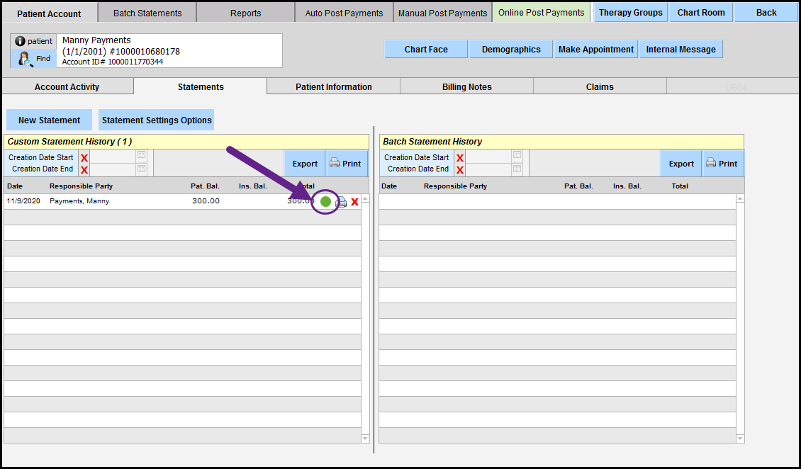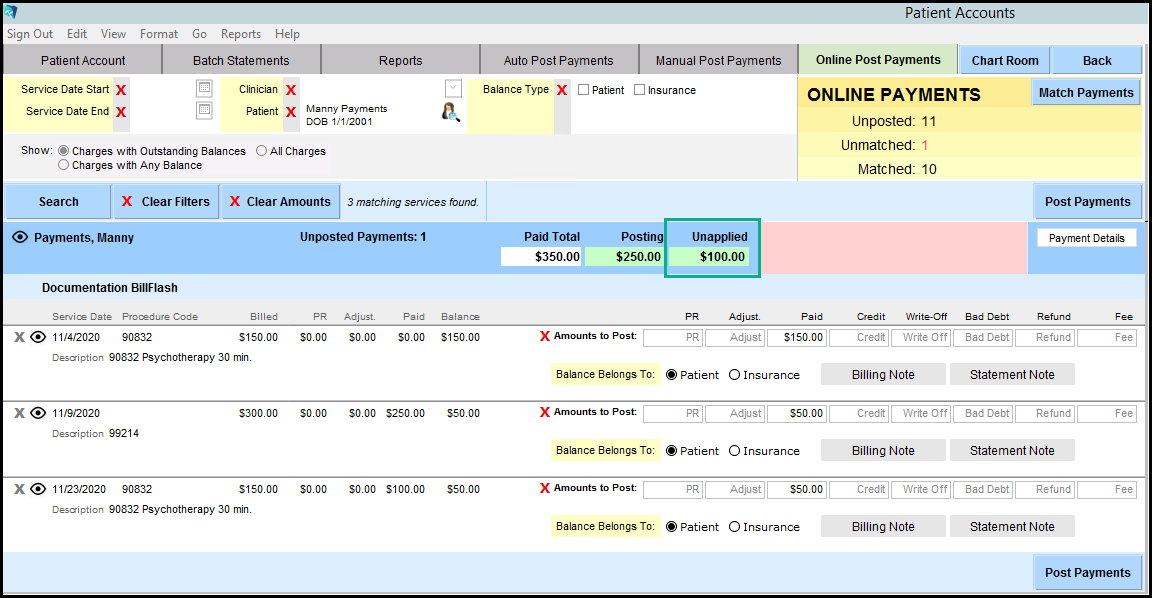 1. There is a handy indicator screen in the upper right that summarizes how many matched vs unmatched patients there are. In the screenshot below, one is unposted and one is unmatched.