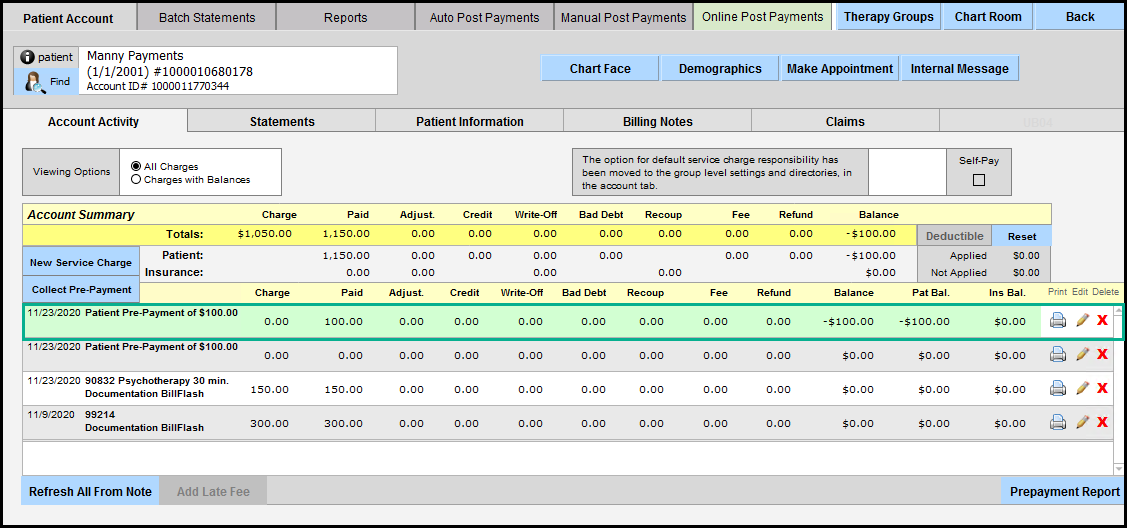 8. Now post payments as before under the Paid column. Any payment amount remaining will populate as a Prepayment in the Patient Account. In the example below, there will be a prepayment of $100.