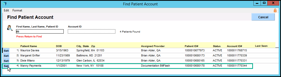 4. Search for the patient by clicking the Select Patient' button. When the patient is found, click the 'Set' button by the patient's name.