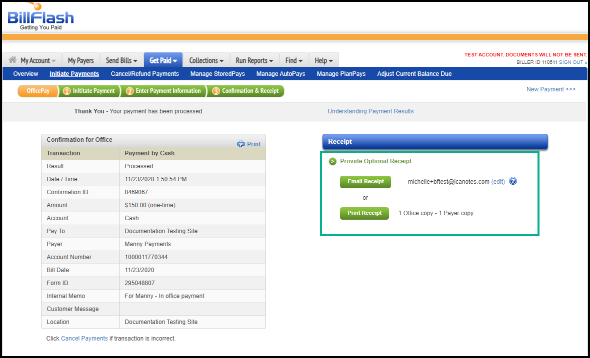 7. The system will show you a confirmation screen from which you can print or email a receipt.