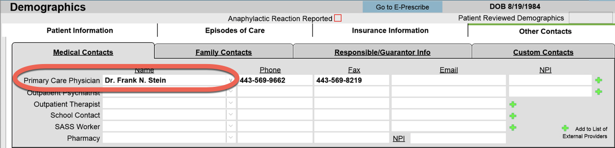 Check the Other Contacts tab in Demographics to locate the Primary Care Physician input field.