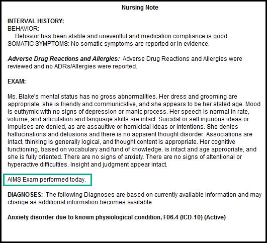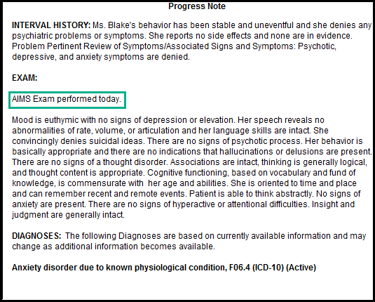 When the box is checked to include the results of the AIMS Exam in the note, this is how that information will appear (shown in a Complete Evaluation):