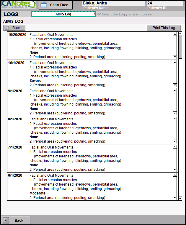 Each time you perform the AIMS Exam, the results are recorded in the AIMS Log located in the Logs Tab on the Chart Face.