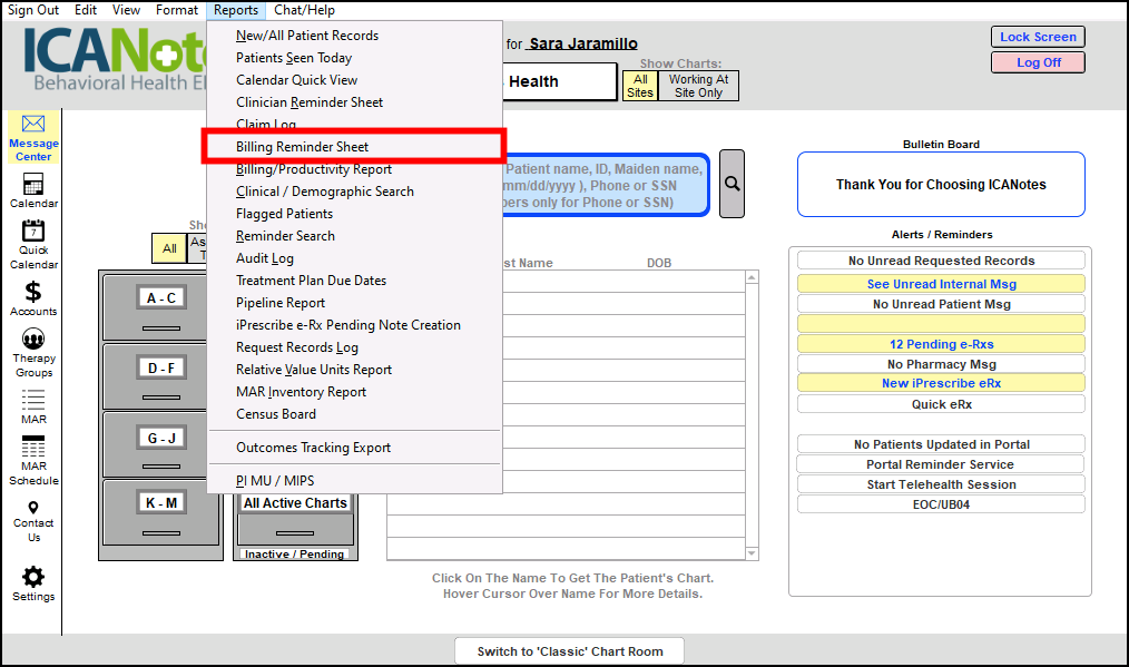 You can access the Billing Reminder Sheet from the Reports dropdown menu in the upper left corner of your ICANotes session.