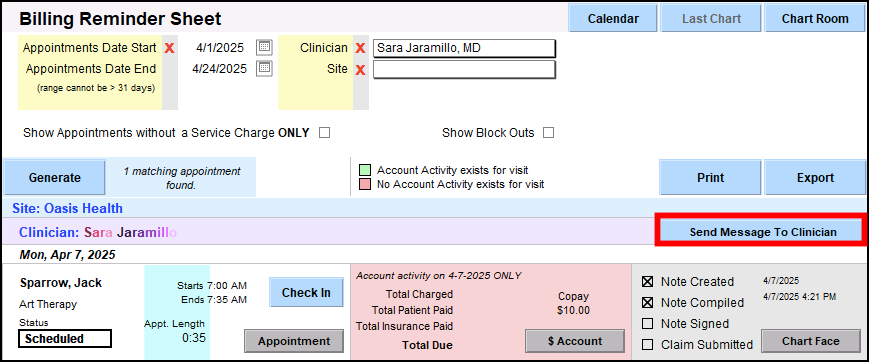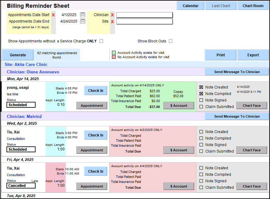 Checking will only show appointments scheduled for patients who do not have any charge recorded in their patient account. Checking will include any blocked out time on a clinician’s calendar in this report. These are filtered out by default because they are not typically associated with a patient appointment. Here is what a generated Billing Reminder Sheet may look like: