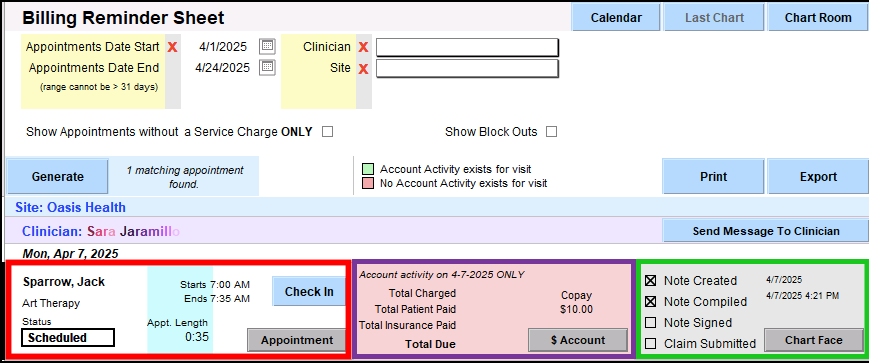 Right Column (green box): Shows if a note has been created and compiled for the visit and if a claim has been submitted. This is an important column for both front office staff and billing staff to review. If the clinician has not created a note for the patient by the time a payment or copay is collected, the front office staff will know they need to go back at the end of the day and link the charge recorded in Patient Accounts to the note created by the clinician. To avoid this extra step, many practices will collect the payment/copay at check out so the clinician has time to open the note that will be linked to the charge. Note: the note does not have to be compiled for the charge to be linked to the note, the note only has to be created. The clinician can go back and finish the note later in the day if needed.