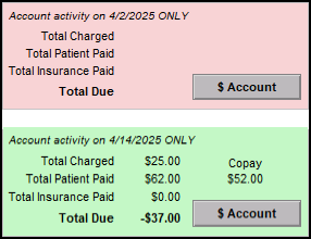 Middle Column (purple box): Shows the patient’s account activity. If the background color is green, then account activity exists for the visit. If red, no account activity exists for the visit. At check in or check out, the front office staff may click on the button to open up the patient’s account and record the charge and payment, if collected.