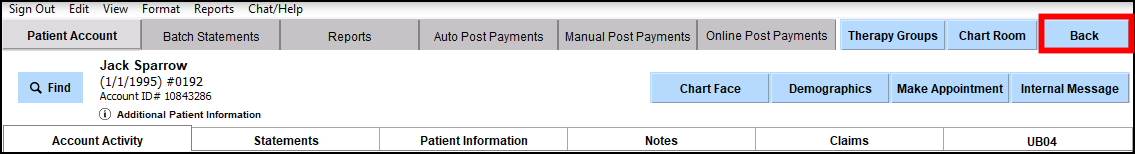 After recording a payment in the patient’s account, the “Back” button can be used to return to this report. Here is a screenshot of the Back button in Patient Accounts: