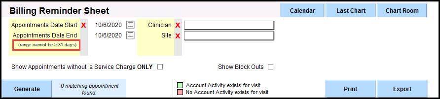 2. Select the filters you would like to use for the report. Appointment Date Start and End is the recommended minimum filter, but you can also filter by Clinician and Site. This report is limited to 31 days.