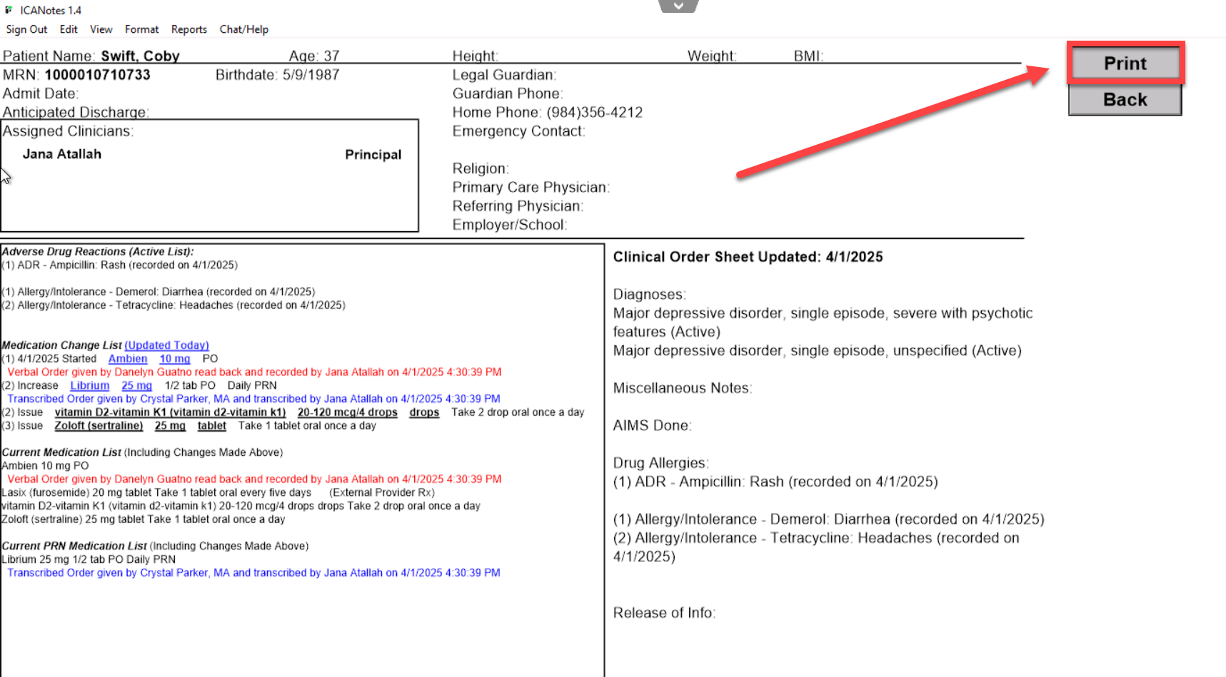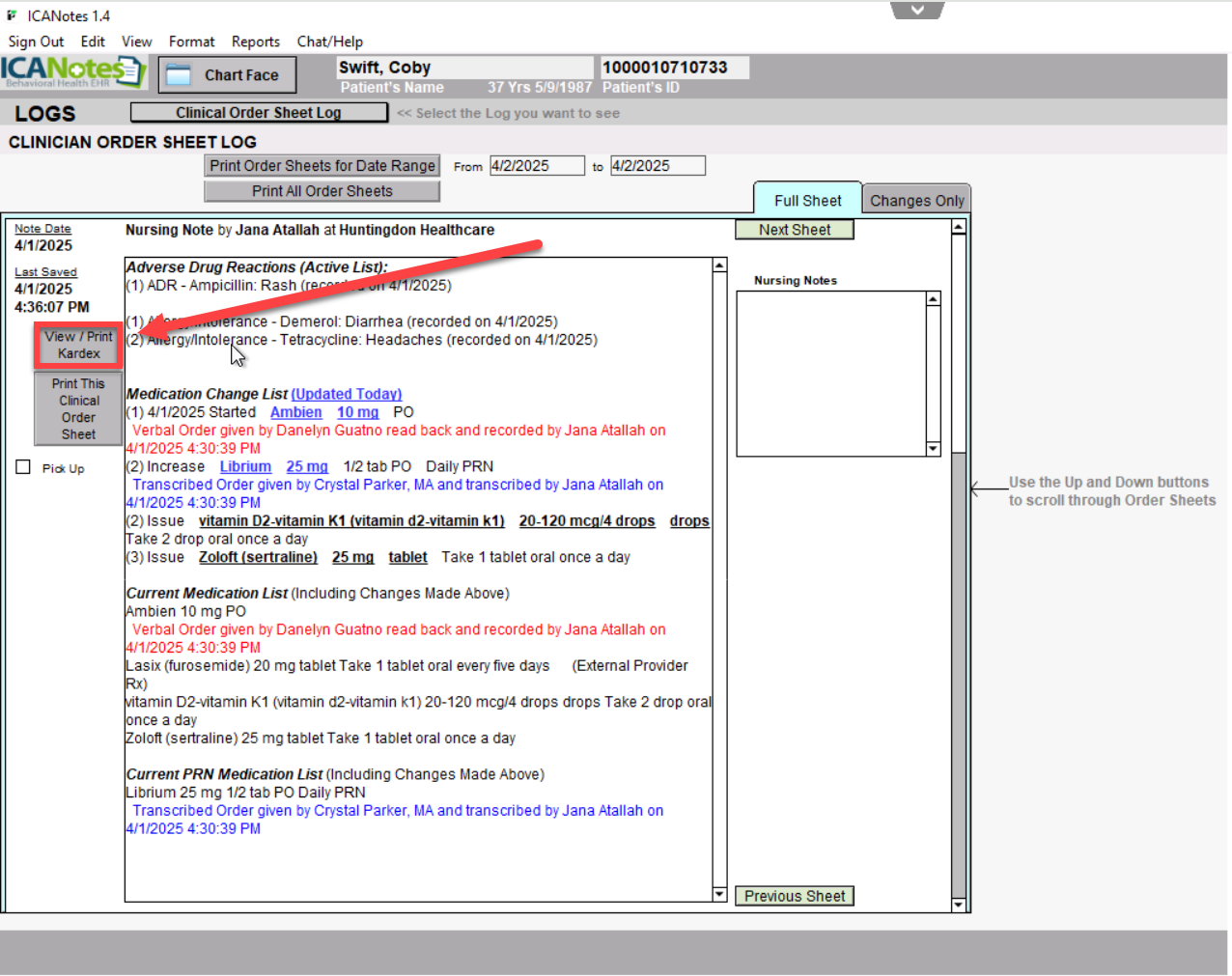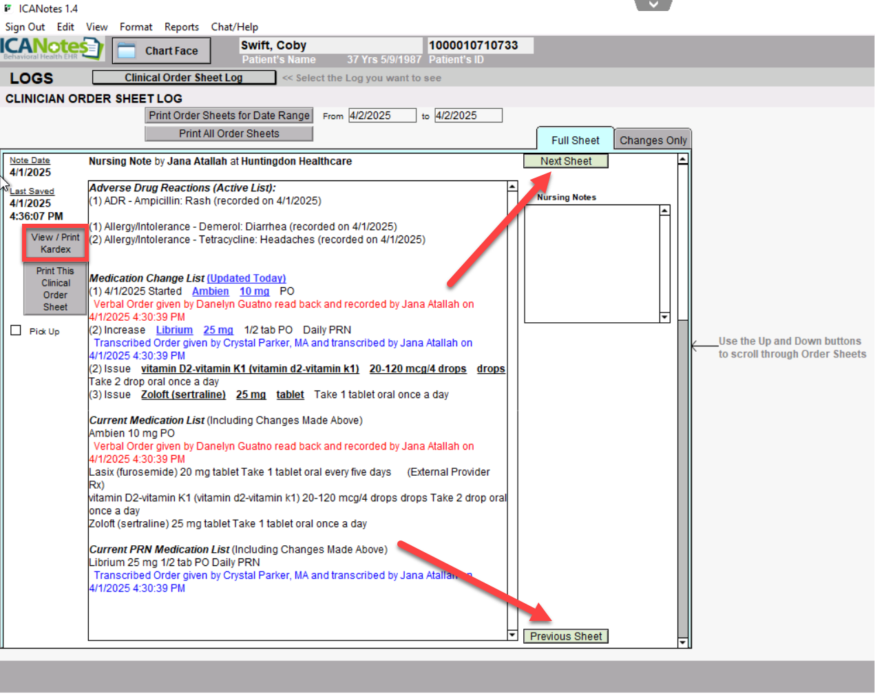 4. To view the Kardex for past dates, use the Previous Sheet and Next Sheet buttons within the Clinical Order sheet to navigate between orders, then click to View/Print Kardex from within that sheet.