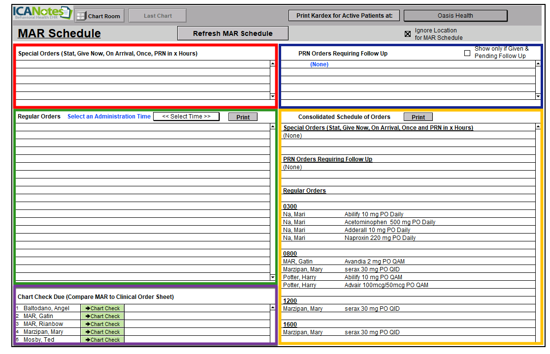 - The purple boxed in area is for the ICANotes MAR Chart Check: The