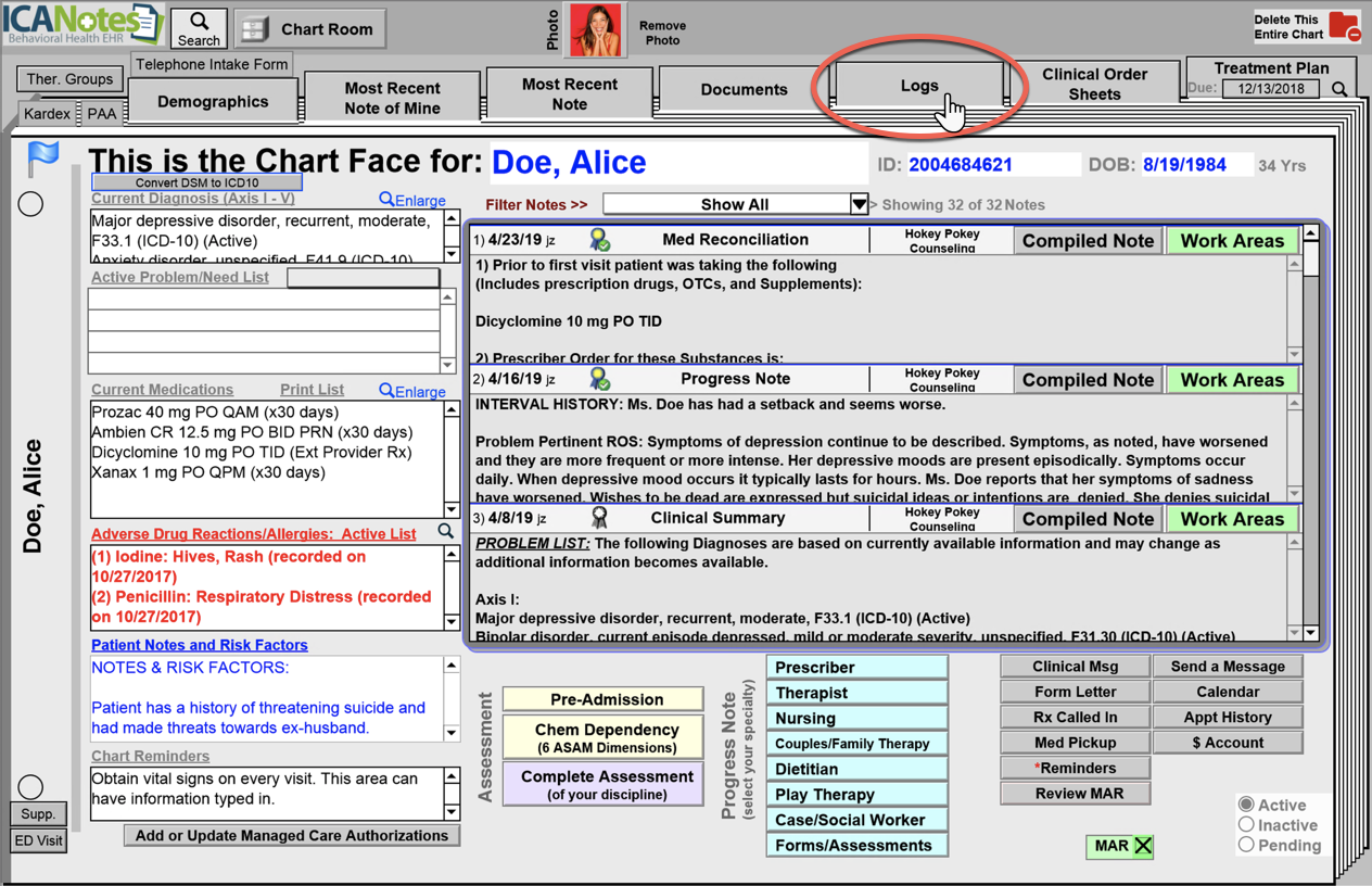 1. From the patient's Chart Face, click the Logs tab.