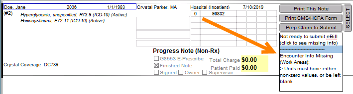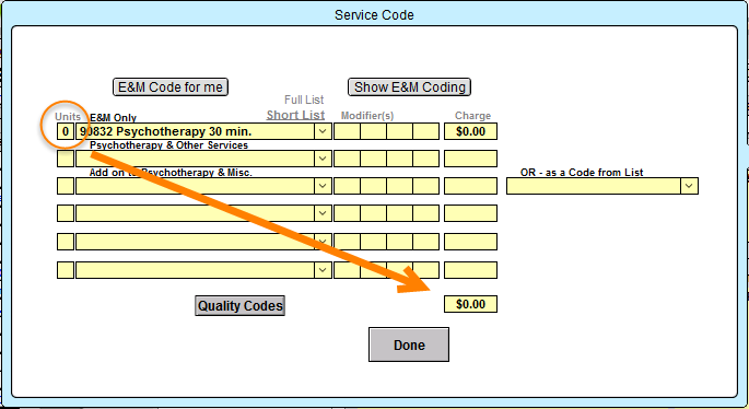 Presently in ICANotes, when no value is added to the units field, the system will assume a total of 1 unit. More than one unit may be entered. However, if zero units are specified, the accompanying service charge will revert to $0.00 and the note will produce an error message when prepping for billing submission in the Billing/Productivity Report: